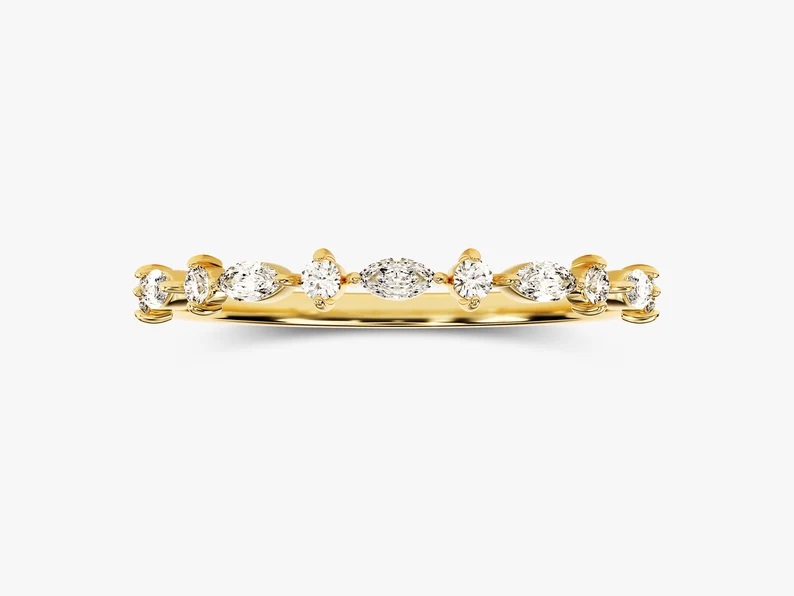 Celebrate timeless beauty and delicate craftsmanship with our Half-Eternity Round and Marquise Cut Natural Diamond Wedding Band. Meticulously crafted in 18k solid gold, this elegant band is available in White, Rose, and Yellow Gold, allowing you to choose the perfect match for your style or bridal set.