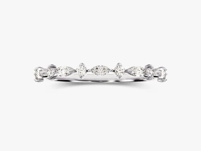 The band features a graceful alternating pattern of marquise and round natural diamonds, totaling 0.215 carats, each selected for GH COLOR and VS-SI Clarity. These fine diamonds create a continuous sparkle across the front half of the ring, symbolizing eternal love and refined elegance.