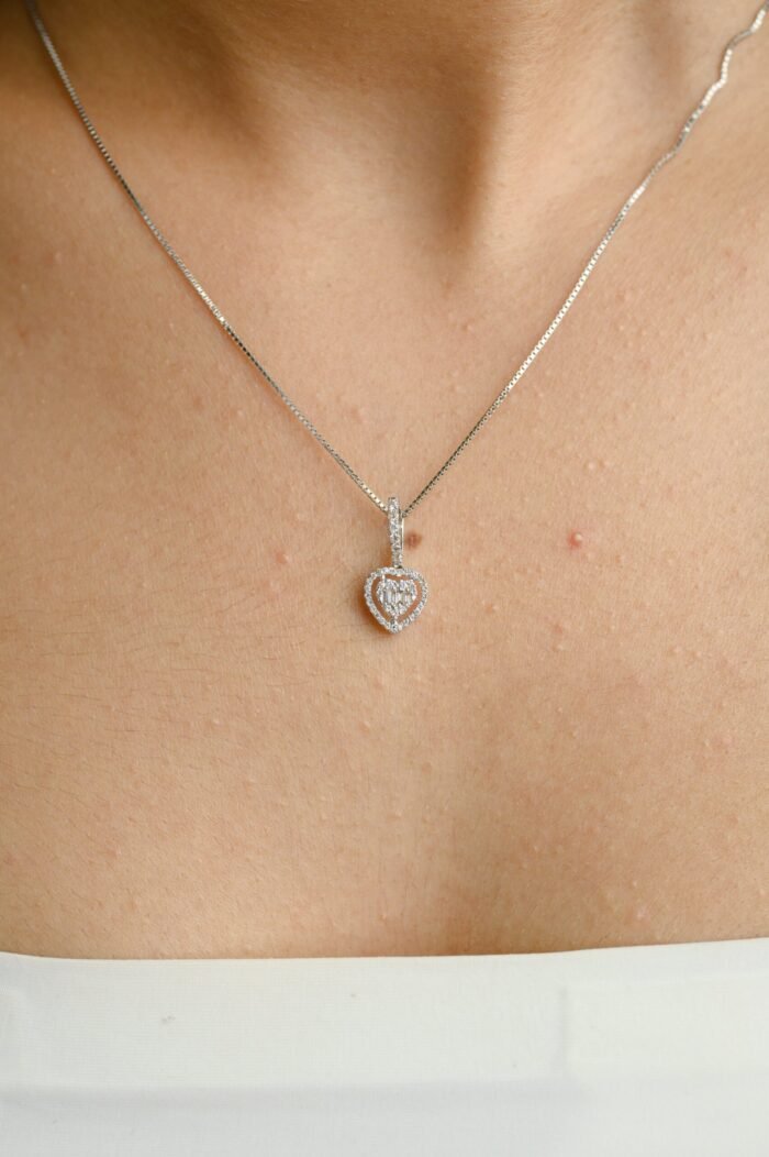 The heart-shaped diamond pendant in white gold is stunning. It’s a timeless piece perfect for any occasion.