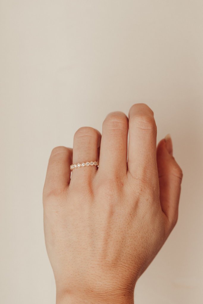 The Hexagon Milgrain Natural Diamond Band is a stunning fusion of vintage charm and contemporary elegance. Crafted from solid 18k gold, this exquisite ring features a hexagonal pattern accentuated by intricate milgrain detailing, adding a touch of antique sophistication.