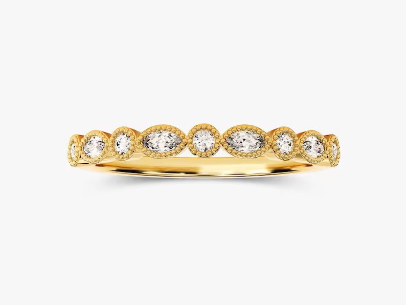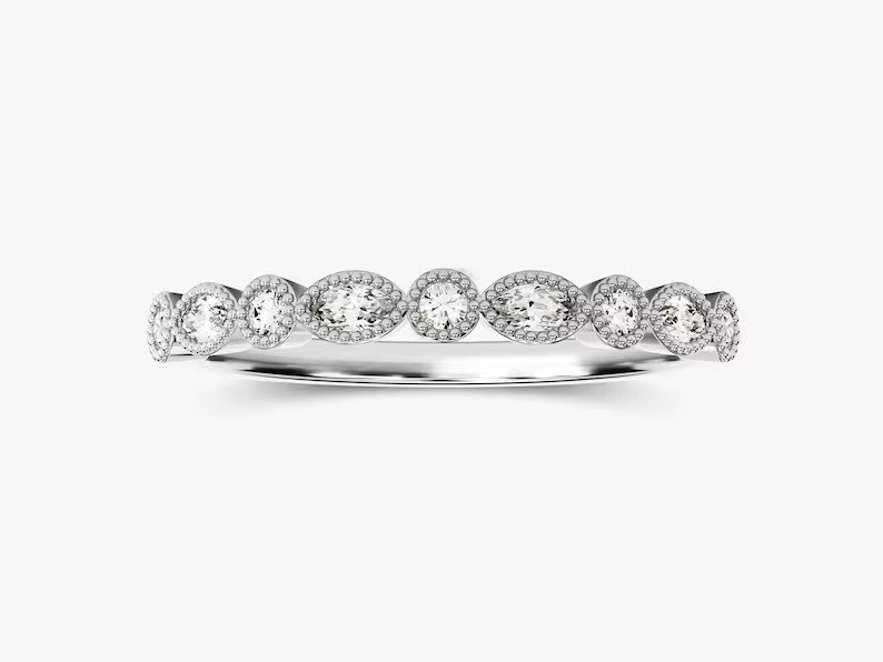 The design features a stunning combination of marquise and round-cut natural diamonds, delicately set in a shimmering alternating pattern. With a total diamond carat weight of 0.24 Ct, each stone is meticulously selected for its GH COLOR and VS-SI Clarity, ensuring brilliance and exceptional quality. The ring’s detailed migraine accents along the edges add a touch of antique charm, elevating its sophistication and uniqueness.