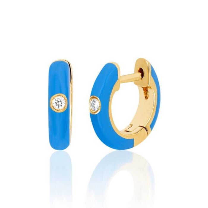Designed in a classic huggie style, these earrings feature a rich blue enamel finish that beautifully contrasts with the brilliant Moissanite diamond accents. The diamonds, known for their exceptional sparkle and clarity, enhance the modern yet timeless appeal of these earrings. The secure hinge closure ensures a comfortable fit, making them perfect for everyday wear or special occasions.