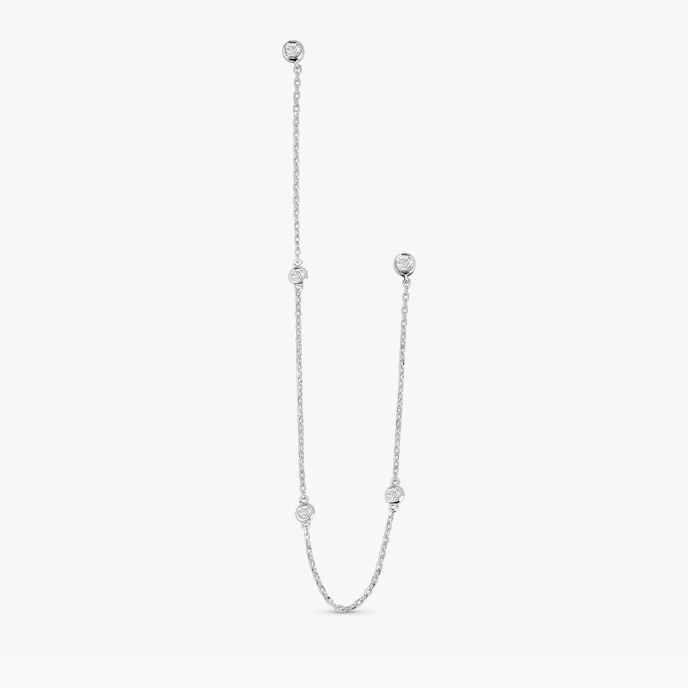 The total diamond weight for one side of the earrings is 0.20 carats, making them a truly luxurious accessory for any occasion. The bezel size on the stud measures 3.5 mm, while the chain measures 2.8 mm in diameter. The chain size between the two studs is 5.5 inches, allowing for graceful movement and added allure.