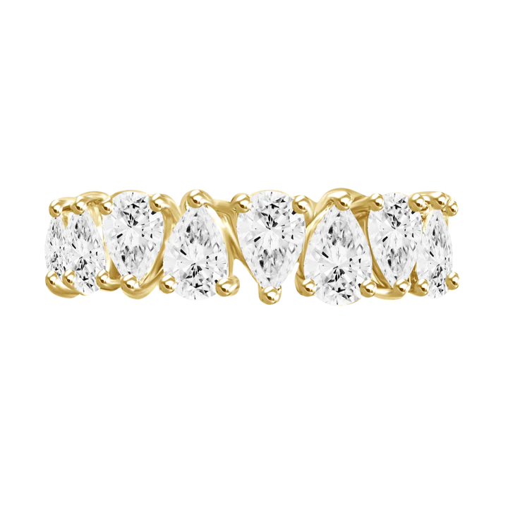 Available in white, rose, and yellow gold, this eternity band features an impressive 3.27 carats of natural diamonds. Each diamond is selected for its GH Color and VS-SI Clarity, ensuring a radiant and consistent sparkle across the entire band. The pear-shaped design offers a modern yet romantic aesthetic, perfect for women who appreciate fine jewelry that stands out with subtle sophistication.
