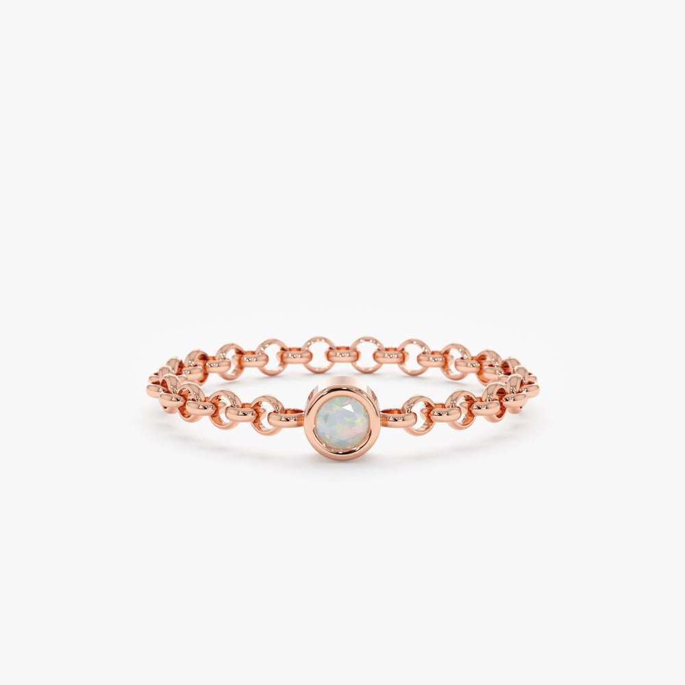“A delicate 14K solid gold chain ring featuring a vibrant opal, offering a minimalist and elegant design perfect for stacking or everyday wear.