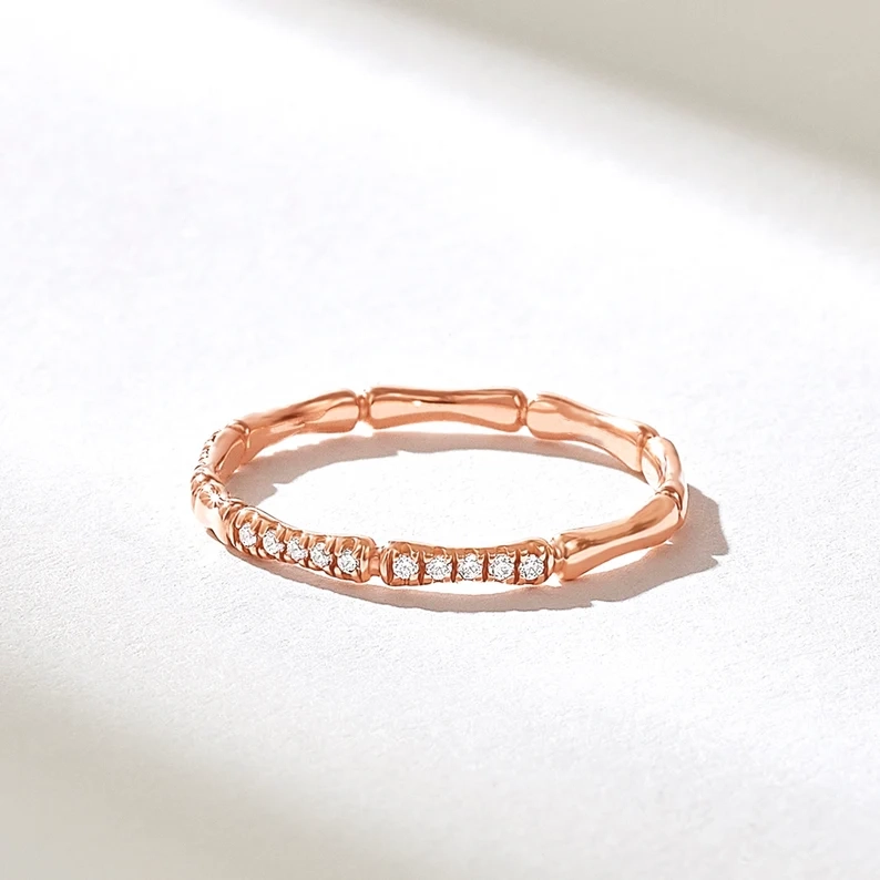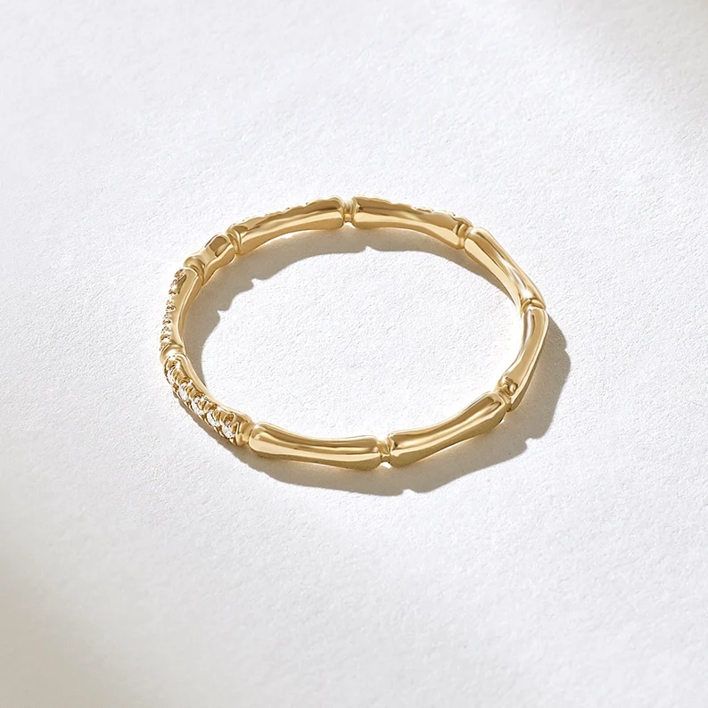Unique 18k solid gold bamboo-inspired knuckle ring with 0.20ct pavé natural diamonds. Elegant, lightweight, and GIA & BIS Hallmarked certified.