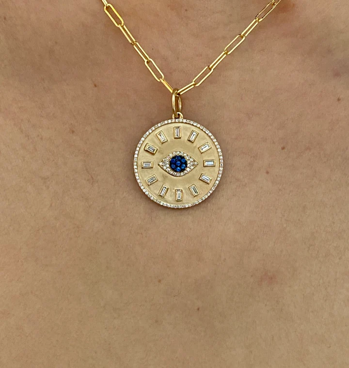 14K Solid Gold Peace & amp; Protection Baguette Diamond And Sapphire Evil Eye Talisman