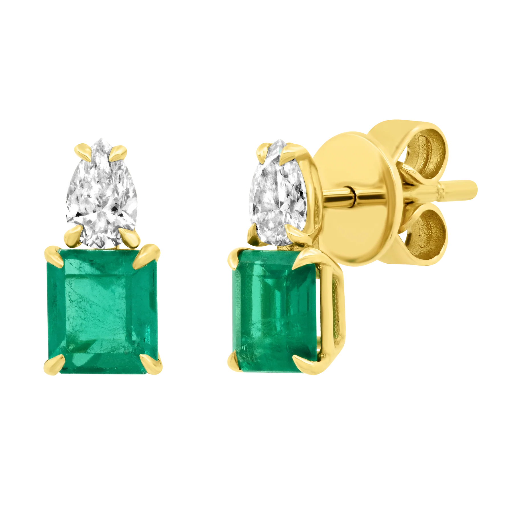 Elegant 14K solid gold stud earrings featuring a pear diamond and an emerald-cut emerald, combining sparkle and vibrant color for a sophisticated look.