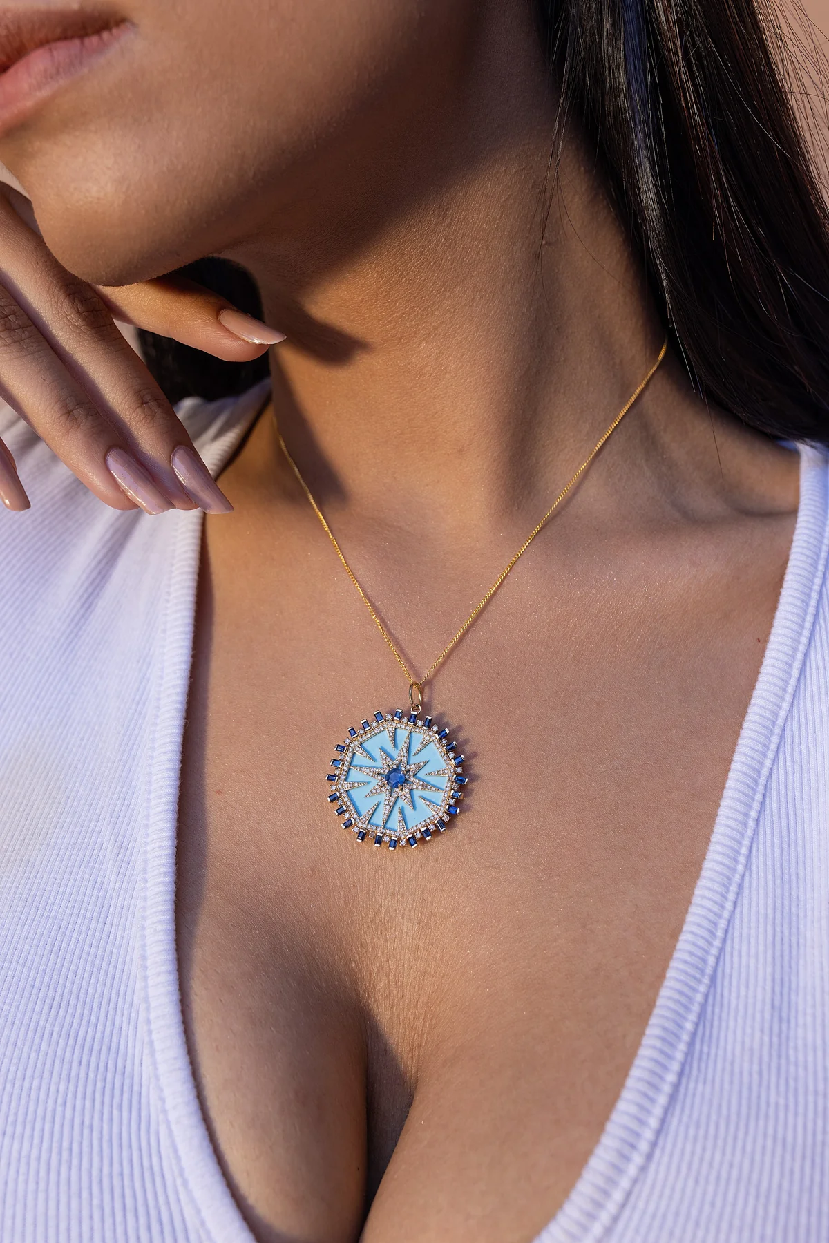 Embrace timeless elegance with the 14K Solid Gold Sleeping Beauty Turquoise Pendant . This exquisite charm features a captivating 11.34-carat natural turquoise, symbolizing serenity and protection. Accentuated with 1.49 carats of deep blue sapphires and 1.17 carats of brilliant diamonds, this pendant radiates sophistication and charm. Weighing 8.45 grams, with a solid gold weight of 5.65 grams, it offers a luxurious yet comfortable wear. Perfect as a December birthstone pendant, this BIS-hallmarked piece is available in white, rose, and yellow gold, making it an elegant gift or personal keepsake.