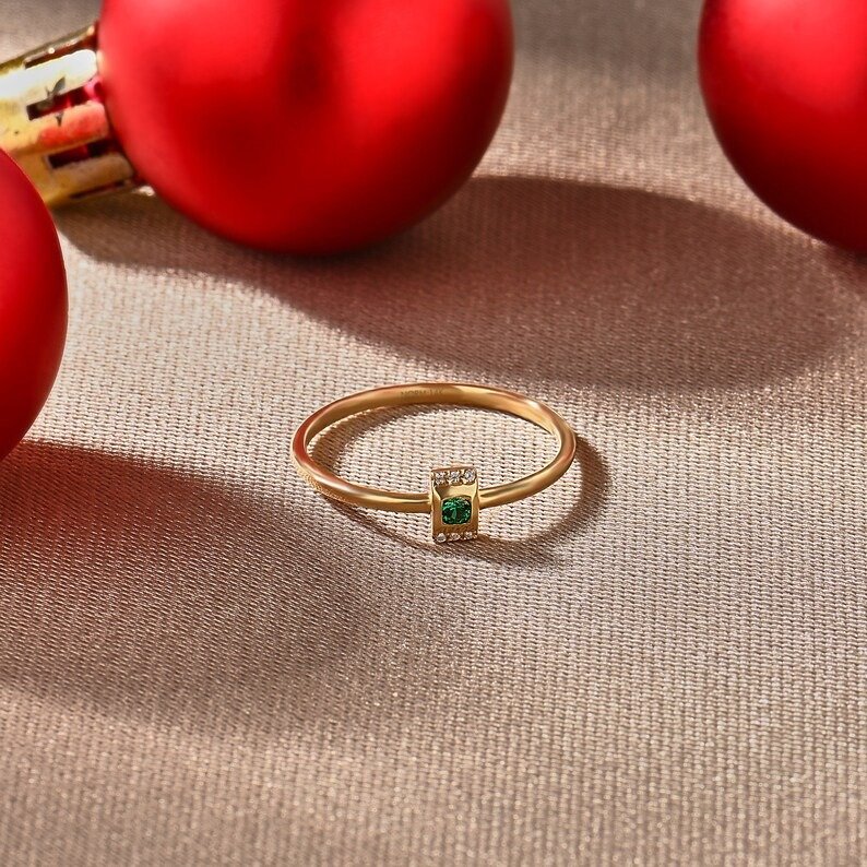 Elegant 14K solid gold minimalist emerald promise ring, combining timeless design and vibrant color for a sophisticated and meaningful gesture of love.