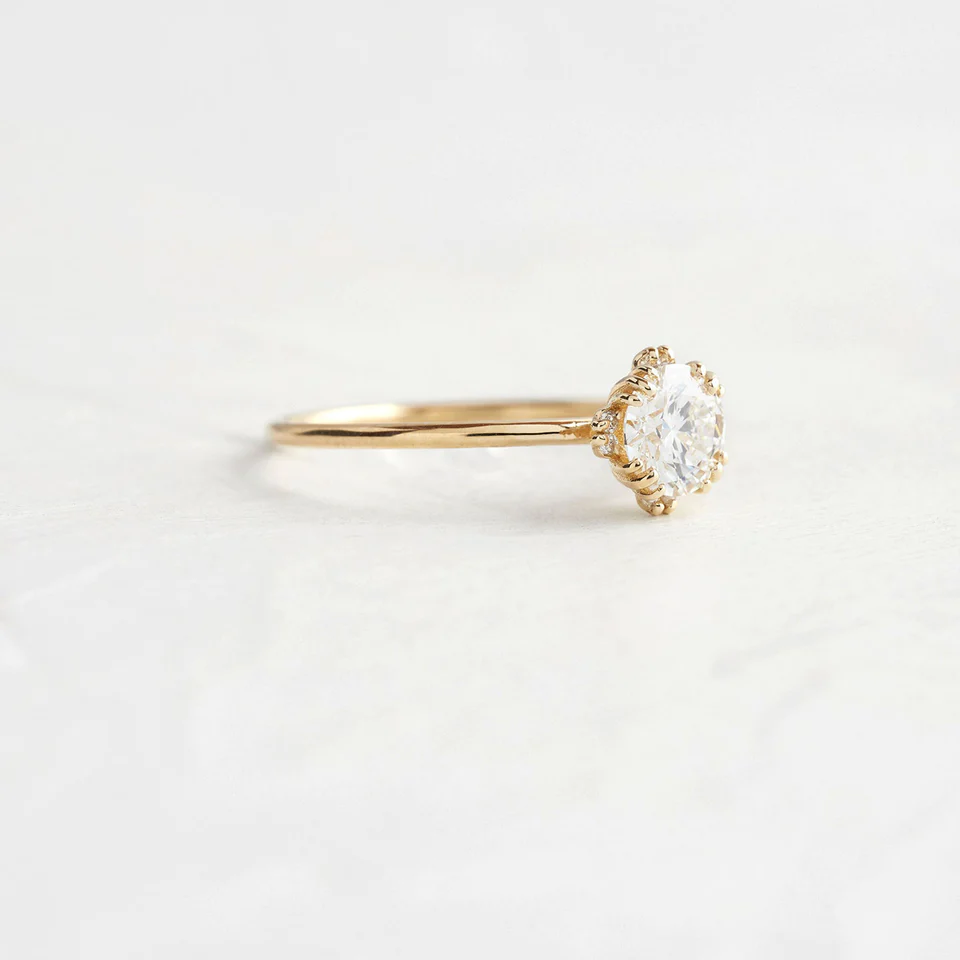 Elegant 18k gold halo ring featuring a 0.7ct round-cut moissanite diamond in a modern threaded band. Available in white, rose, and yellow gold. BIS Hallmarked for authenticity.