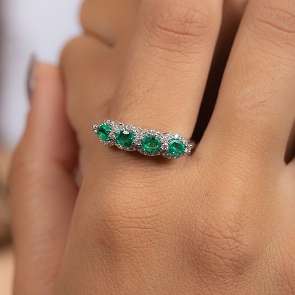 14K Solid Gold Emerald and Natural Diamond Half Eternity Ring