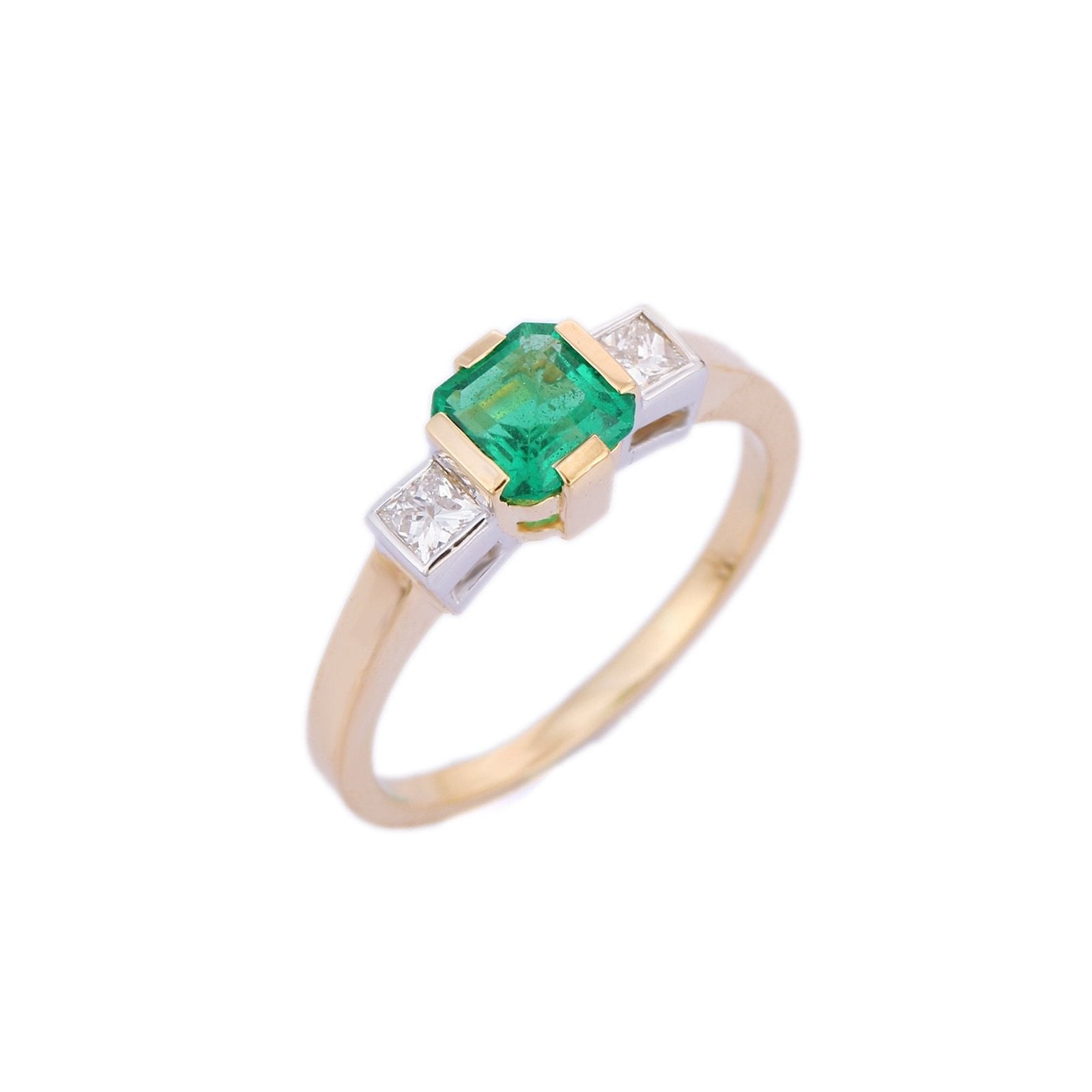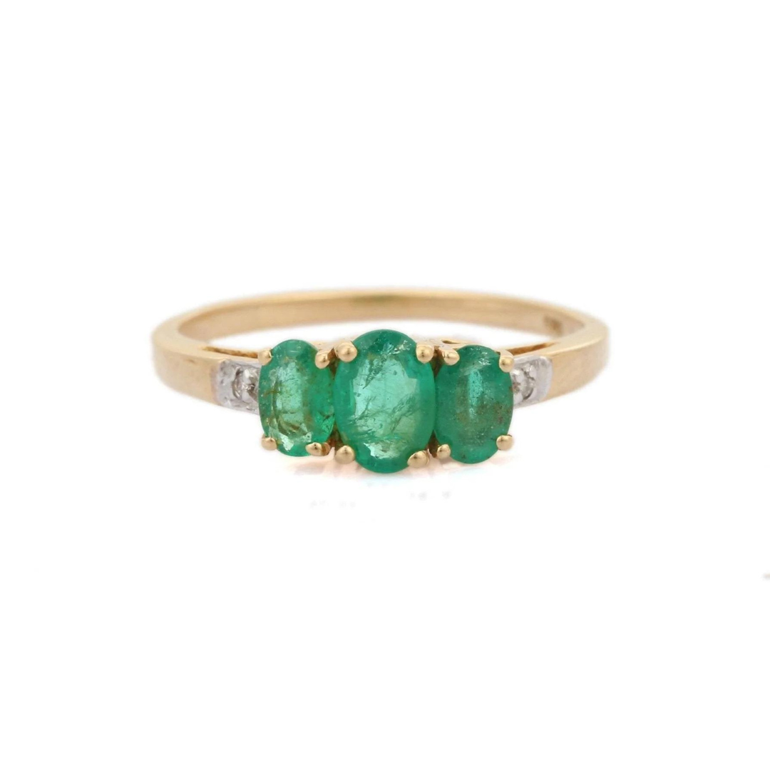 14K Solid Gold Emerald Diamond Three Stone Ring