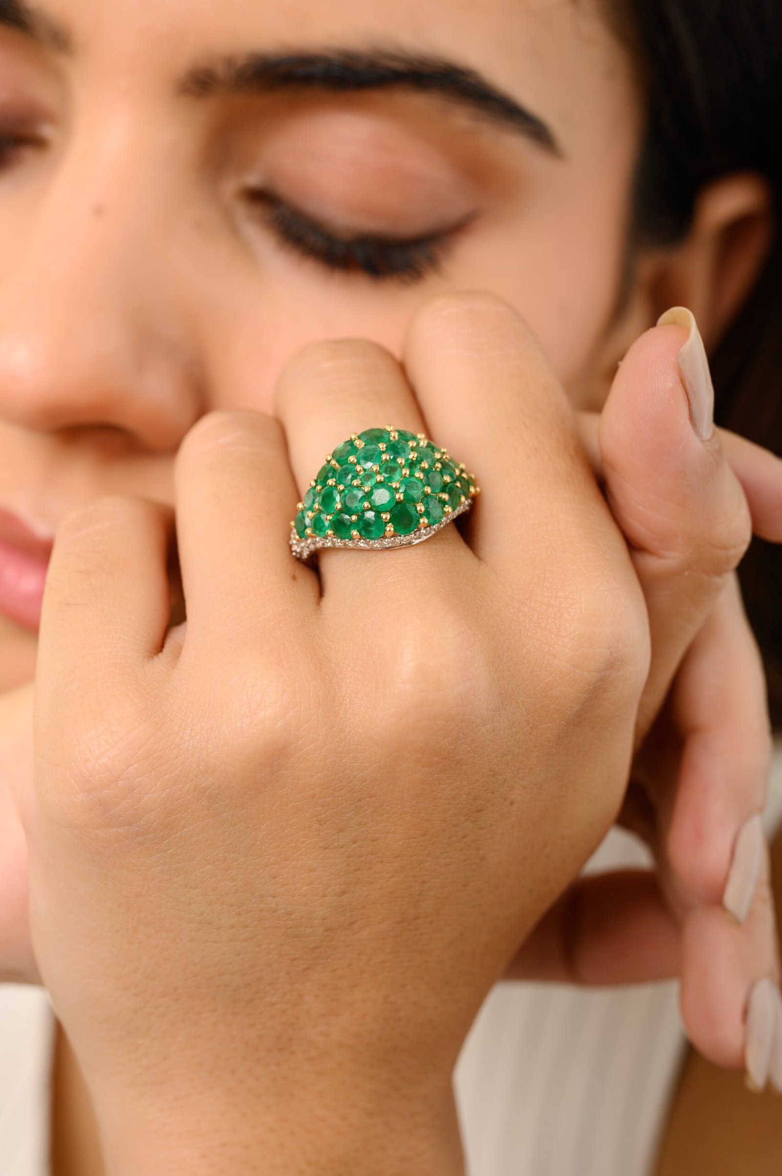 Elegant 14K solid gold emerald iconic cluster ring, combining vibrant emeralds with a unique design for a luxurious and eye-catching statement piece.