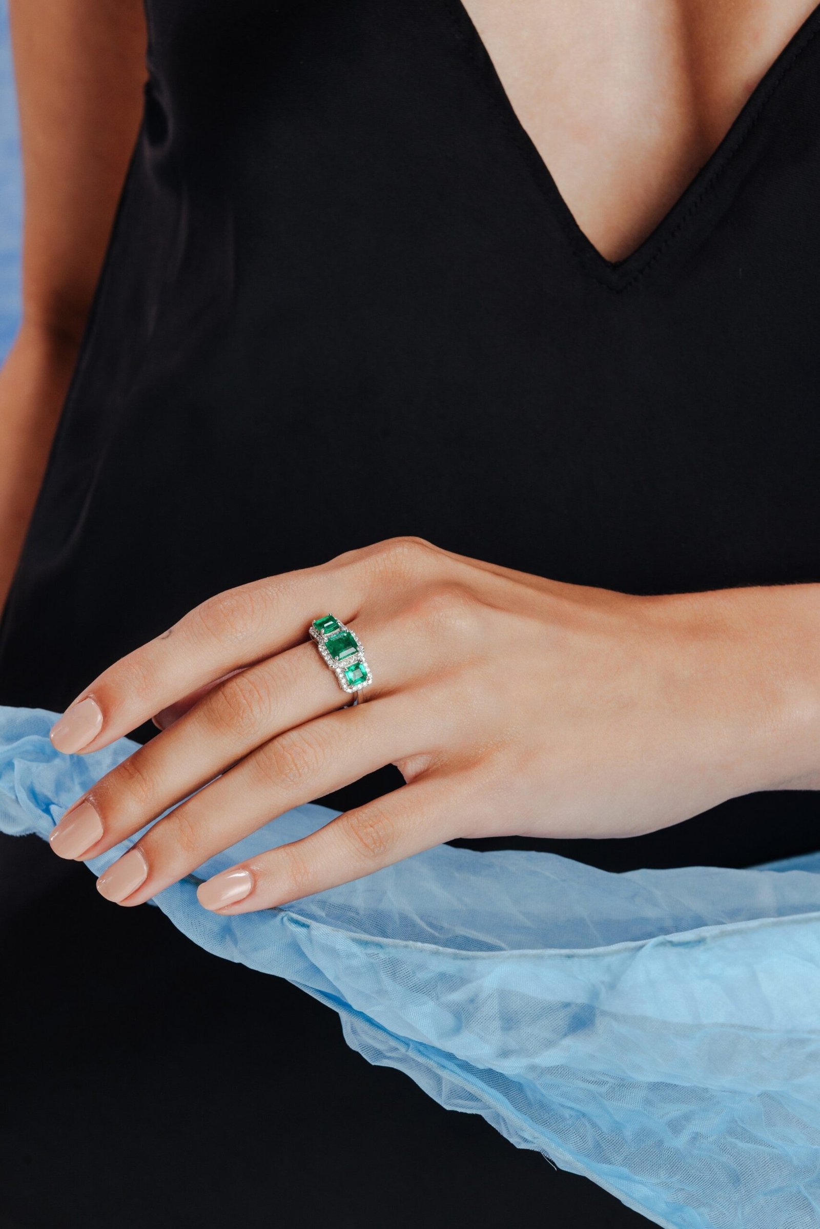 14K Solid Gold Emerald Diamond Halo Trinity Ring