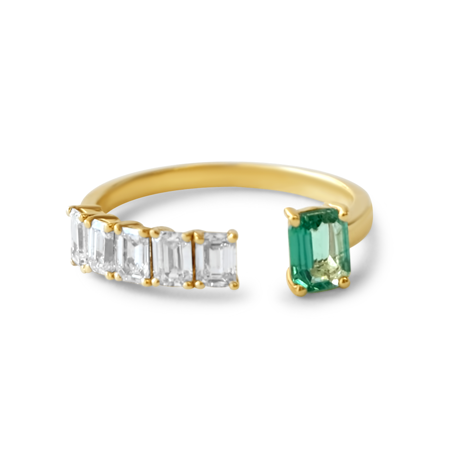 14K Solid Gold Emerald Cut Diamond Emerald Open Ring