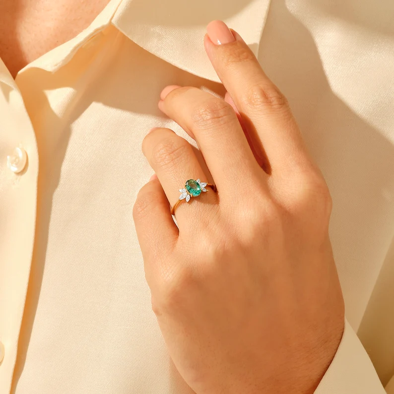 14K Solid Gold Emerald Handmade Floral Ring