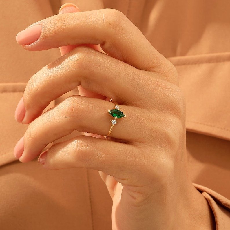 14K Solid Gold Emerald Marquise Ring