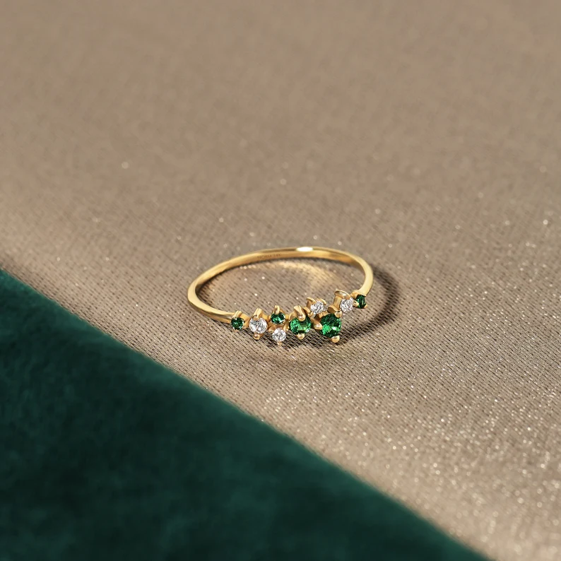 Delicate 14K solid gold ring featuring a graceful curve adorned with vibrant emeralds—crafted for modern elegance and everyday sophistication.