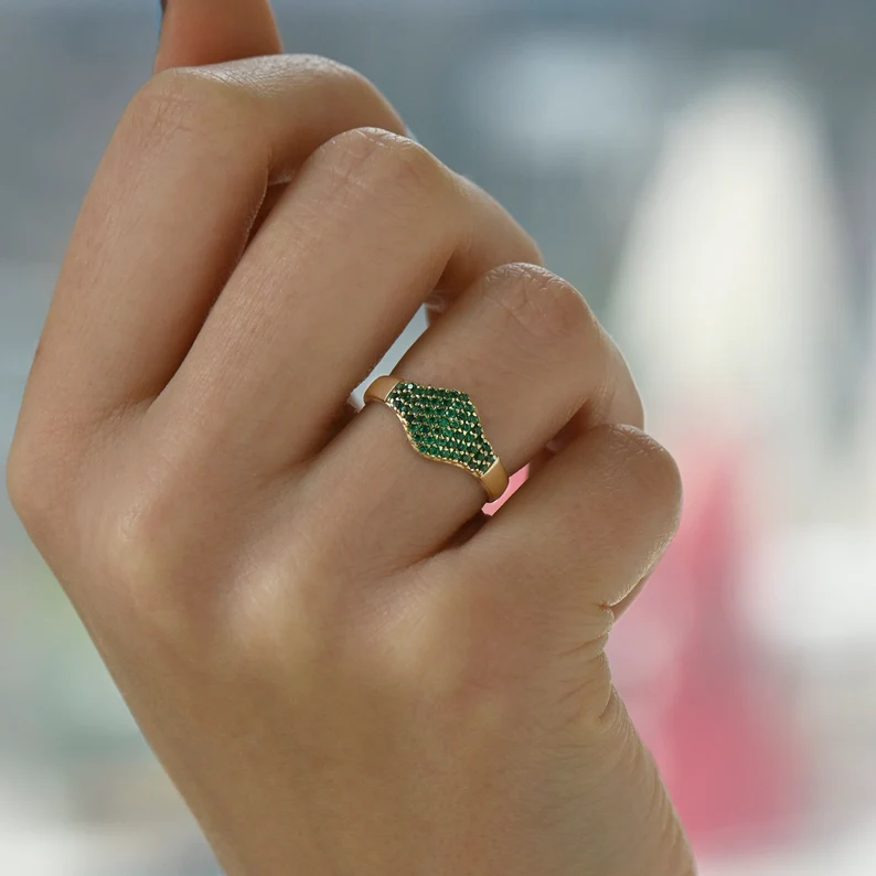 14K Solid Gold Emerald Flat Pave Signet Ring