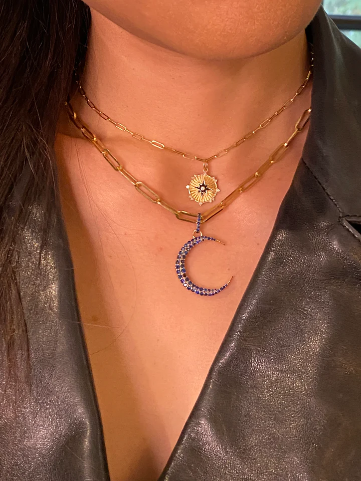 14K Solid Gold Sapphire Crescent Moon Pendant