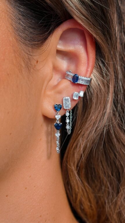 "Elegant 18k Gold Moissanite Diamond Sapphire Heart Loop Earring – a beautiful heart-shaped loop design with Moissanite diamonds and sapphires for a radiant, romantic style."