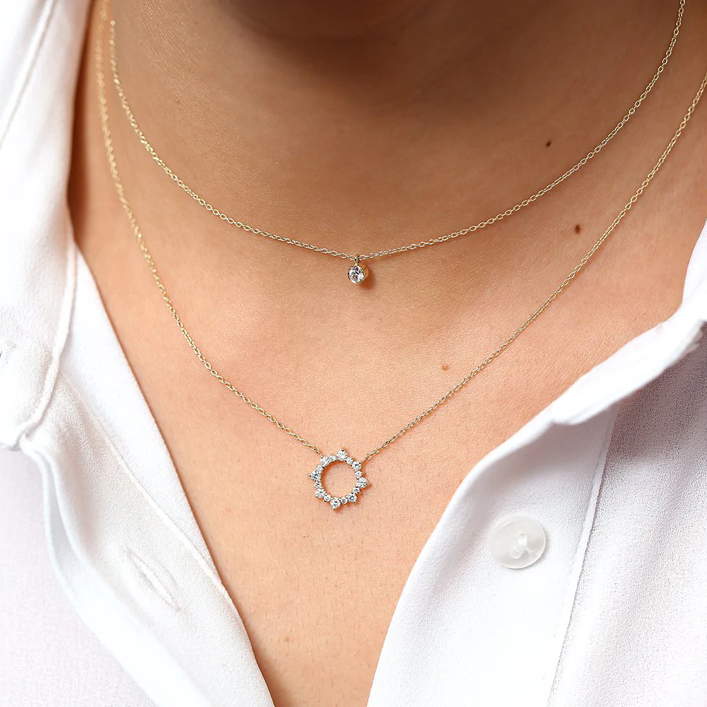 這款精美的項鍊採用上等18K金手工打造,散發著溫暖奢華的光芒,與璀璨奪目的鑽石相得益彰。太陽環的設計象徵著溫暖與正能量,使這款項鍊成為您珠寶收藏中意義非凡的點睛之筆。