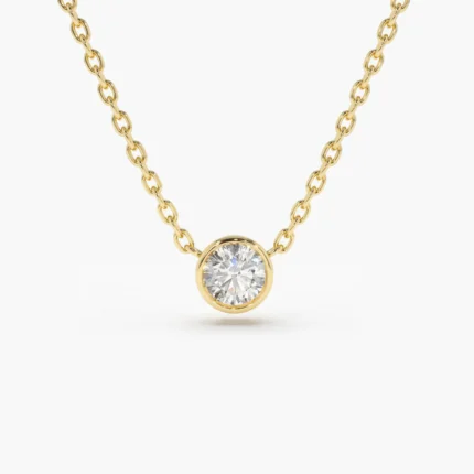 14K金包鑲天然鑽石單石項鍊,一顆璀璨鑽石,重量從0.20克拉到0.50克拉不等,牢固地鑲嵌於時尚現代的包鑲之上。這款優雅的項鍊採用14K純金打造(可選白金、玫瑰金或黃金),其簡約的魅力可提升任何造型。鑽石的G色和SI淨度確保了其璀璨的光芒,而耐用的包鑲則更增添了其精緻的魅力。這款項鍊是日常佩戴或出席特殊場合的經典之作,帶有BIS認證標誌,並提供快速配送服務。您可以透過線上聊天和視訊通話獲得客戶支援。