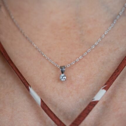 這款 14K 爪鑲天然鑽石單石項鍊鑲嵌一顆璀璨的圓形鑽石,重量從 0.21 克拉到 0.50 克拉不等。這款項鍊採用四爪鑲嵌,提供白金、玫瑰金和黃金三種材質。鑽石顏色等級為 G,淨度等級為 SI。項鍊經 BIS 認證,確保真品品質,10-12 個工作天內出貨,並提供即時聊天和視訊通話客服。