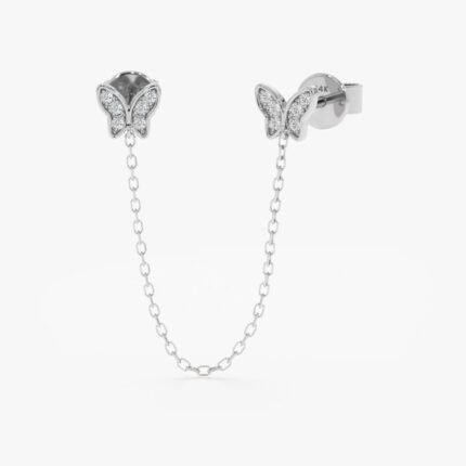 戴上我們18K金打造的天然鑽石蝴蝶鏈耳環,感受飛翔之美。精緻的蝴蝶輪廓點綴著璀璨的鑽石,並以純金鏈條連接,營造出一絲魔幻的氛圍。