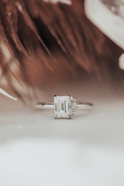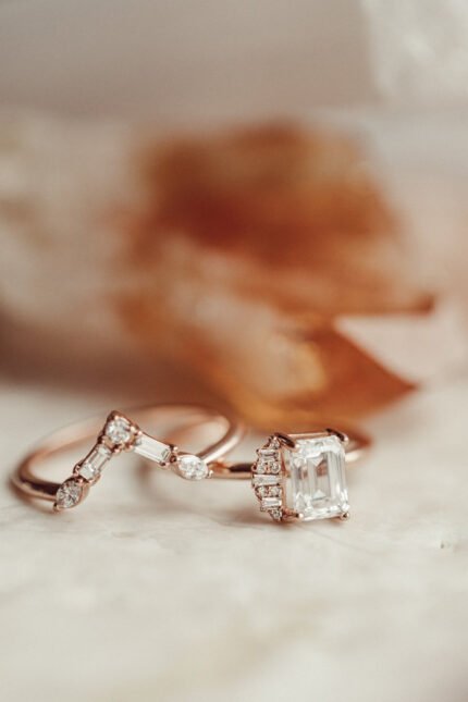 18K 純金實驗室培育鑽石祖母綠切割戒指 2 件套