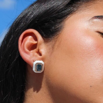 大膽的 18k 純金八角形耳環,鑲有密鑲莫桑石、白色琺瑯和藍色托帕石,散發出現代優雅和鮮豔的光芒。