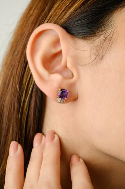 優雅的 18k 純金耳釘,鑲嵌鮮豔的紫水晶,設計永恆精緻,適合任何場合。