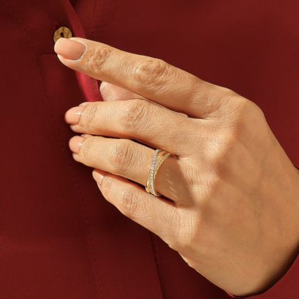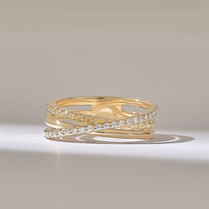 女士三環交叉戒指,14k 純金密鑲莫桑石鑽石