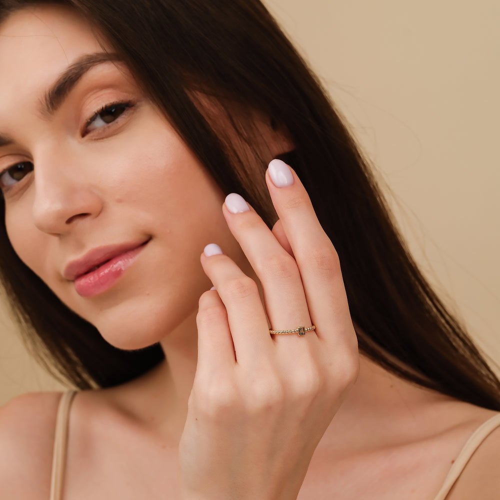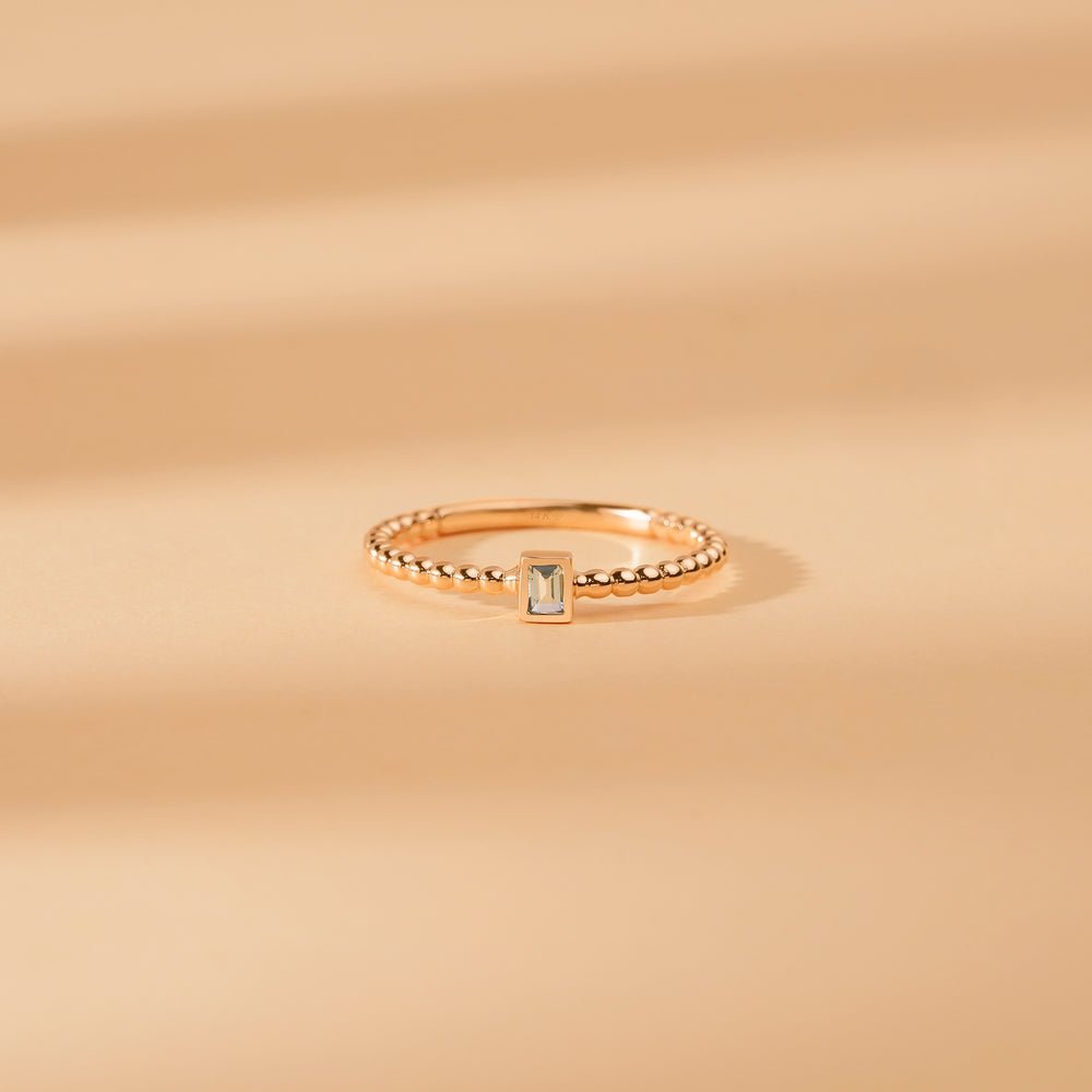這款純金串珠戒指上的海藍寶石誕生石精緻而美麗,非常適合三月生日佩戴。