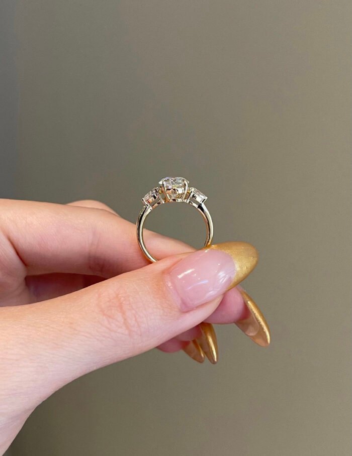 這款三石訂婚戒指採用 18k 金打造,中央鑲嵌一顆令人驚豔的橢圓形切割莫桑石,兩側配以兩顆側石,散發持久璀璨的光芒。