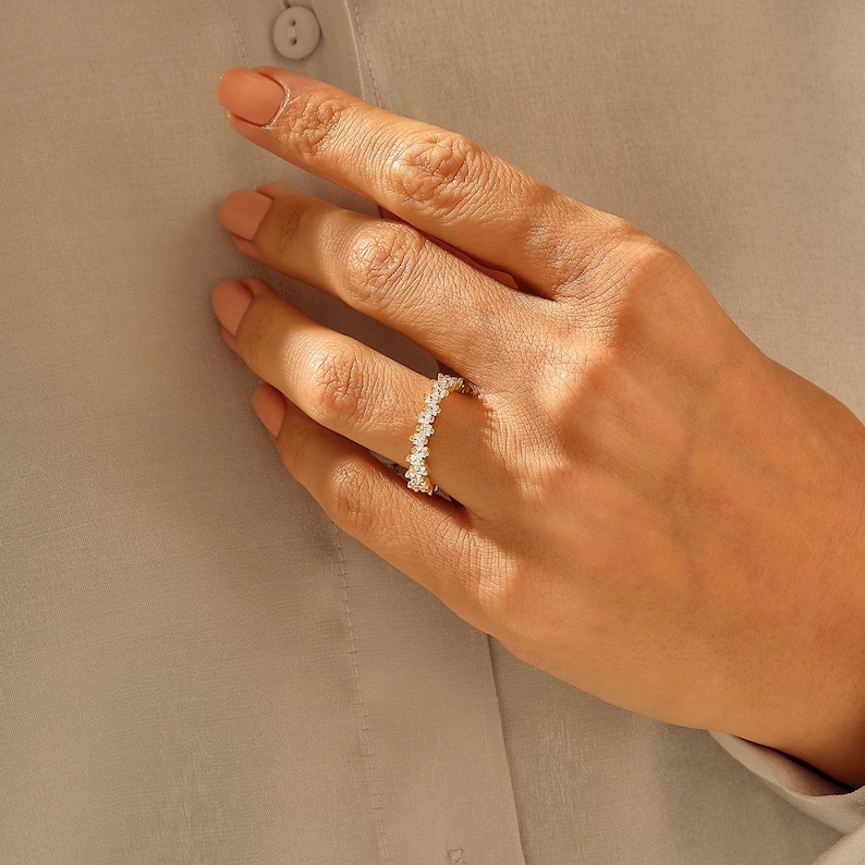 認證機構 BIS 標誌和 GRA這款戒指保證了其真實性、精湛的工藝和持久的耐用性。無論作為 結婚戒指、週年紀念戒指或疊戴戒指, 這 莫桑石鑽石永恆戒指 對任何珠寶收藏來說都是有意義且優雅的補充。