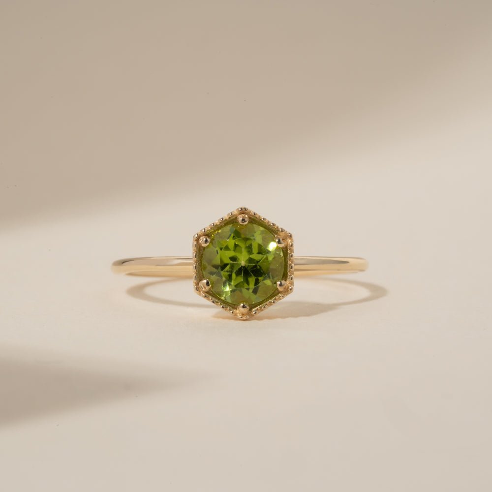六角形橄欖石戒指美極了。它優雅精緻,六角形的設計更增添了一絲獨特的韻味。