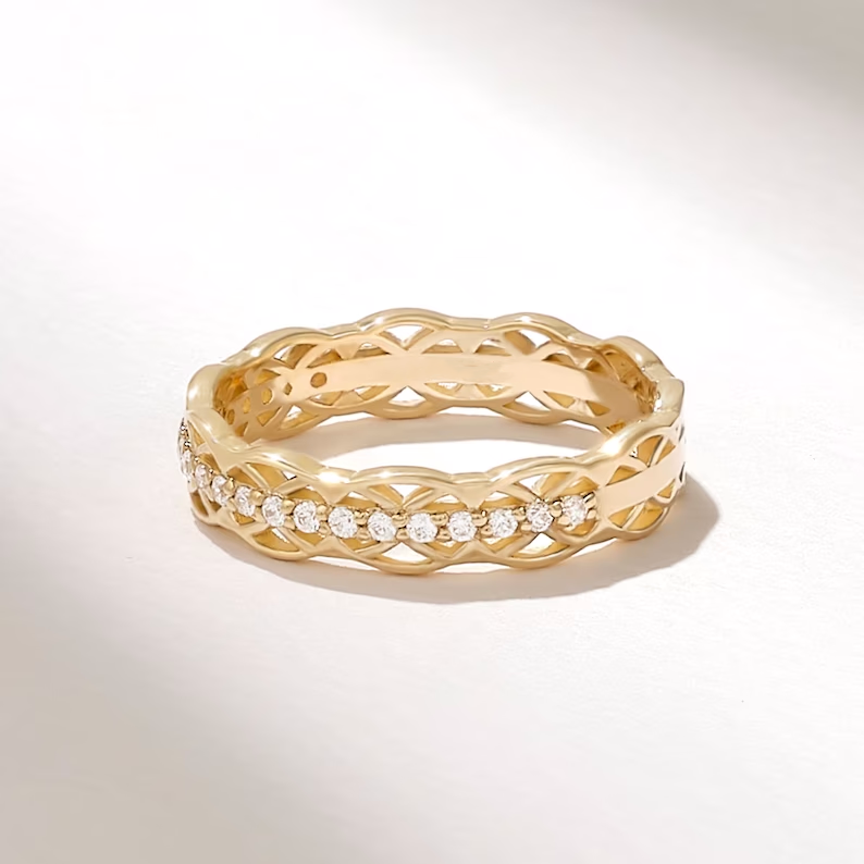 象徵永恆的愛與團結, 凱爾特結結婚戒指 是永恆的寶藏。 18k純金,這款精緻 三位一體結永恆樂隊 採用複雜的結設計,飾有 璀璨的 D 色、VVS1 淨度莫桑石鑽石。無論是作為結婚戒指還是有意義的禮物,這款復古風格的戒指都是承諾和忠誠的絕佳象徵。