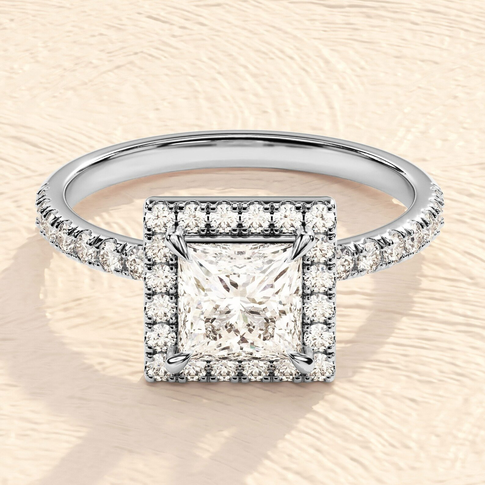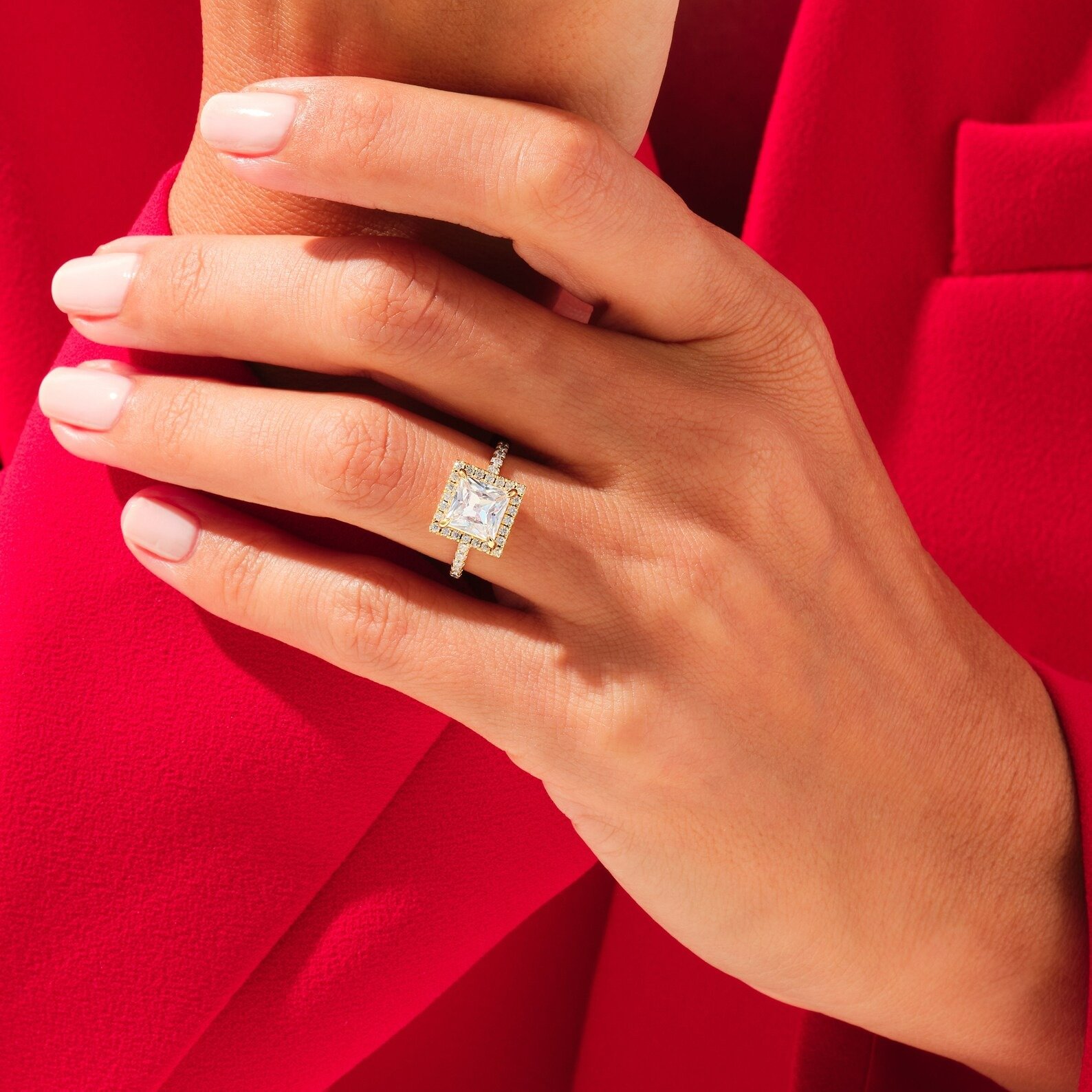 這款 3 克拉墊形切割莫桑石鑽石訂婚戒指採用耀眼的光環鑲嵌,散發出光彩、美麗和永恆的浪漫魅力。