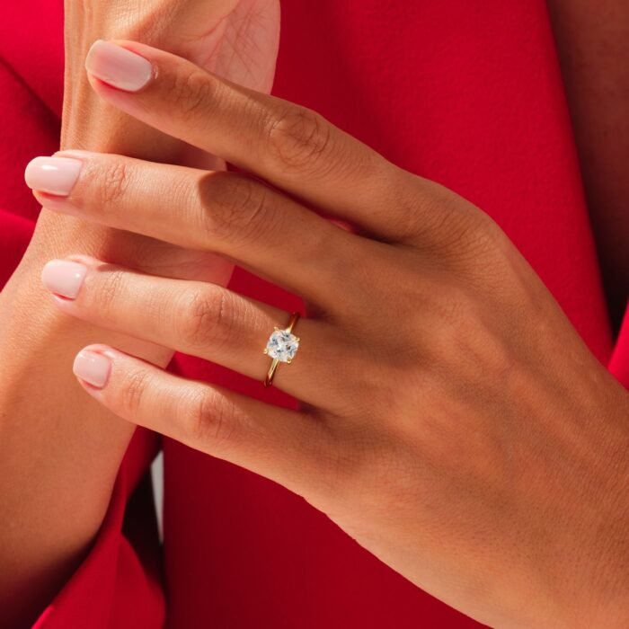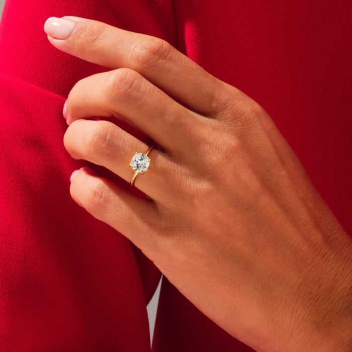 這款 8 克拉墊形切割莫桑石戒指採用純金鑲嵌,散發出令人驚嘆的光芒和經典的魅力,非常適合令人難忘的訂婚或大膽的風格。