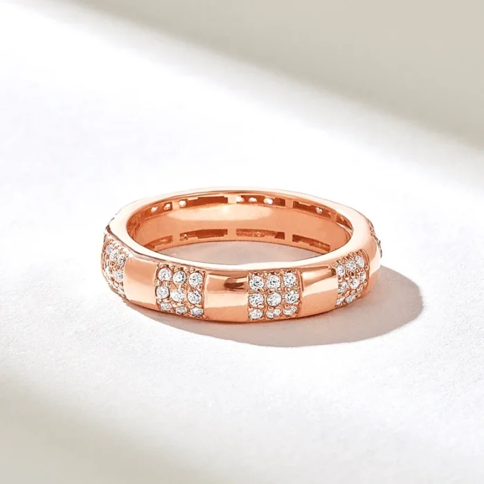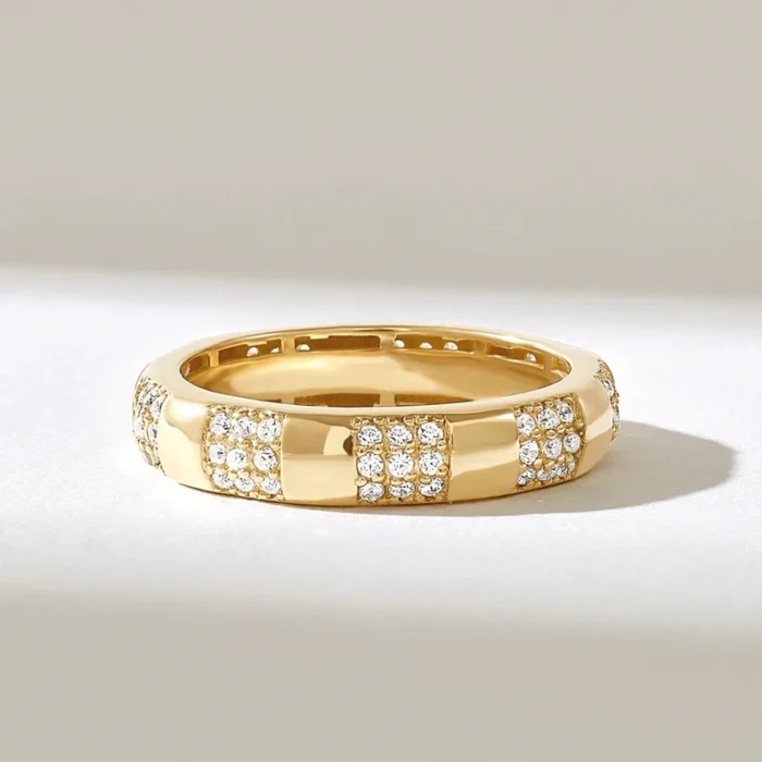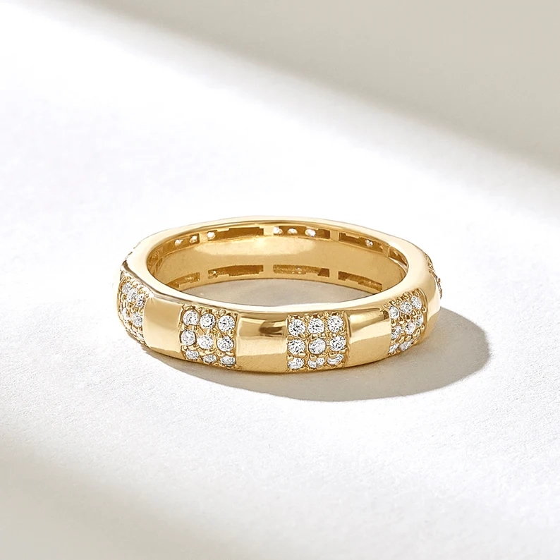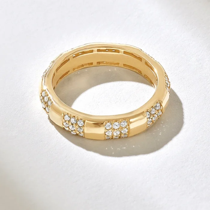 用 大膽密鑲莫桑石鑽石金戒指,一個 厚實的14K純金圓頂戒指 專為現代優雅而設計。這款奢華 結婚戒指 有售 白金、玫瑰金和黃金,提供多種功能以配合您的獨特風格。
