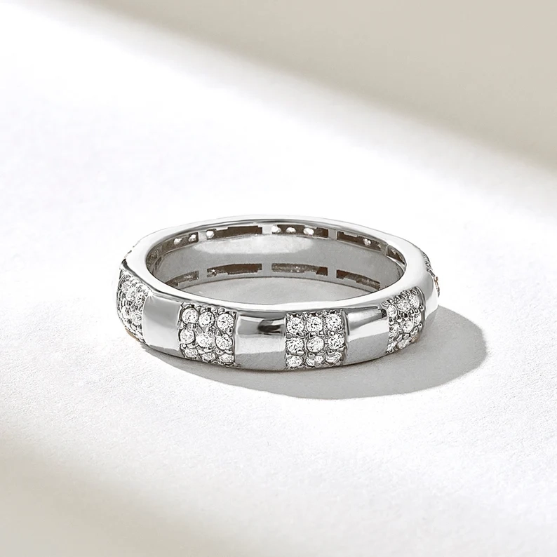精心製作,這款 4.23mm寬的帶子 具有一系列 明亮式密釘莫桑鑽 從各個角度看都閃閃發光。 D 顏色、VVS1 淨度莫桑石鑽石以其卓越的光彩而聞名,散發出耀眼的光芒,營造出令人著迷的效果。 總克拉重量 0.81 CTW,這支大膽而精緻的樂團非常適合 結婚戒指、週年紀念戒指或個性珠寶.