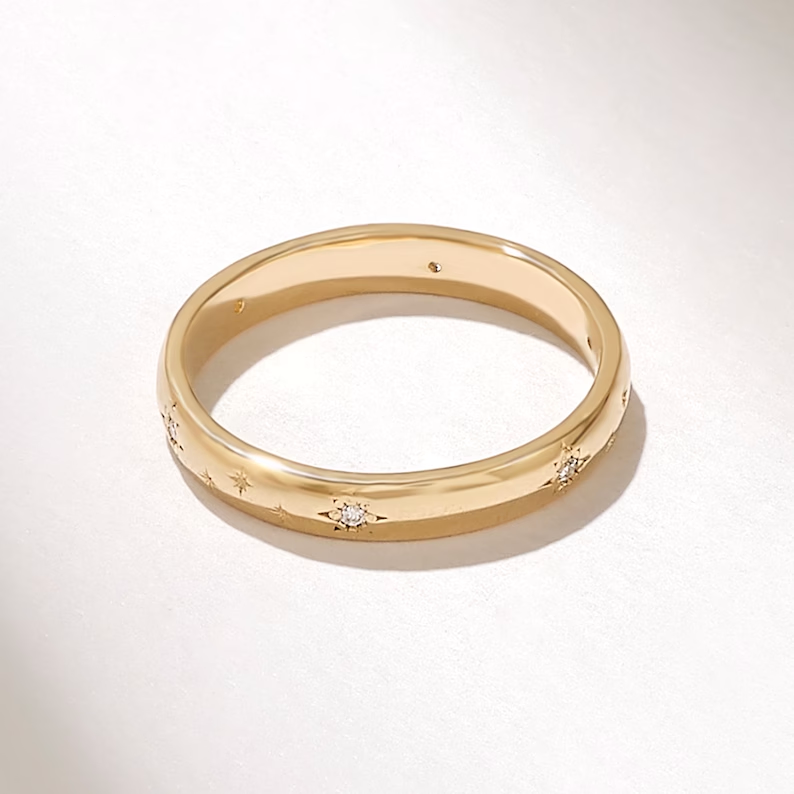 星光璀璨的14K金婚戒,鑲嵌0.05克拉GH色、VS-SI淨度天然鑽石。經GIA和BIS認證。