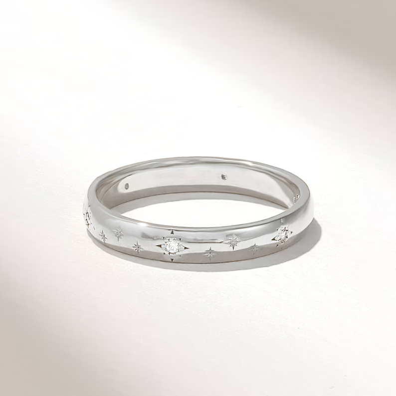 樂隊測量 寬度3.00毫米 和 厚度1.45毫米,提供精緻的輪廓,既舒適又耐用,適合日常穿著。飾有 0.05克拉GH顏色,VS-SI淨度天然鑽石,每顆寶石都經過精密鑲嵌,以凸顯天體圖案的光輝和美麗。