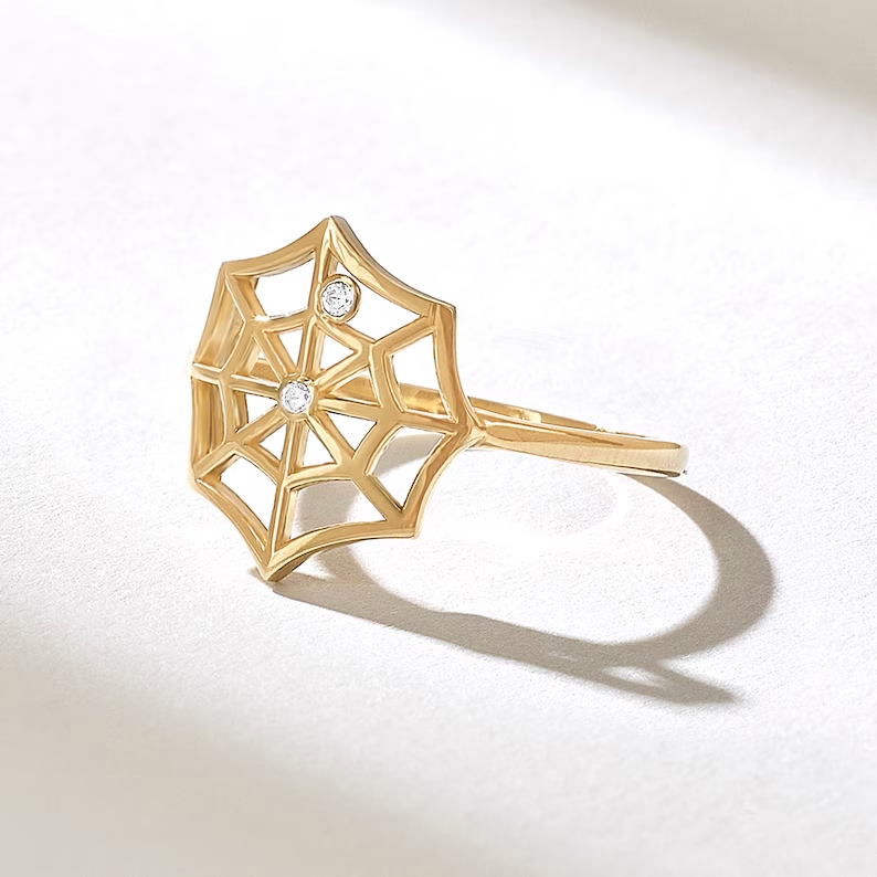 天然鑽石蜘蛛網戒指|18K純金個性戒指|復古波西米亞哥德式