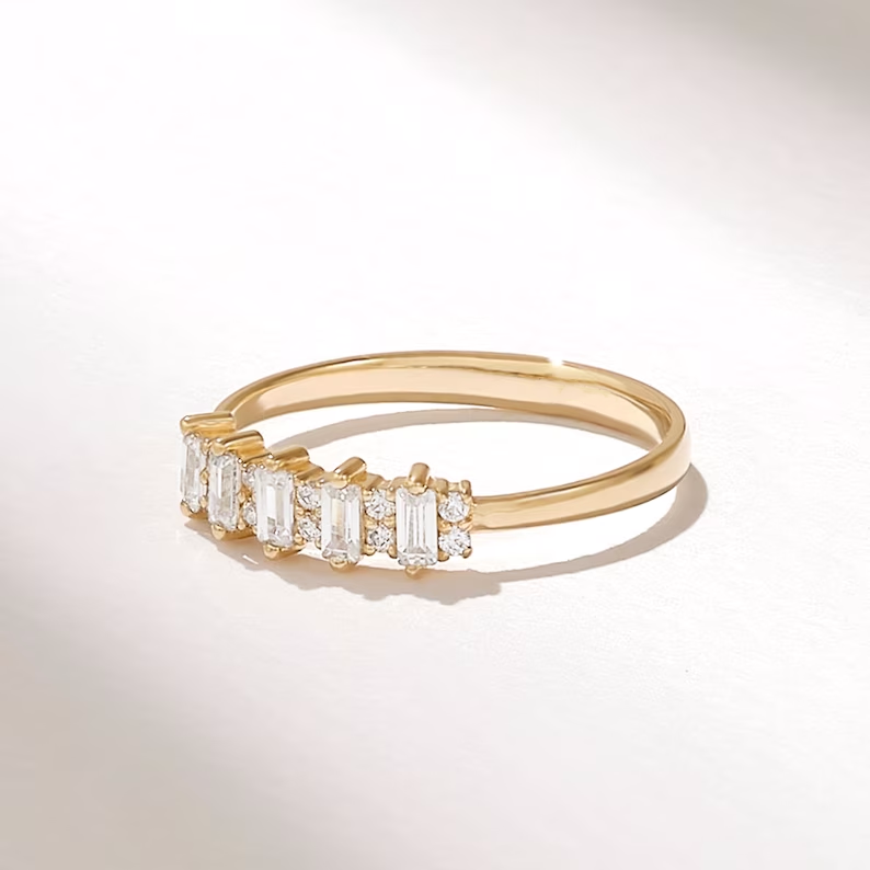 用我們的 天然鑽石長方形結婚戒指,一款精緻而現代的手工製作的樂隊 18k純金。這款時尚的結婚戒指飾有 優質理想切割長方形天然鑽石,每個都展示 GH 顏色和 VS-SI 淨度,兼具光彩與現代魅力。