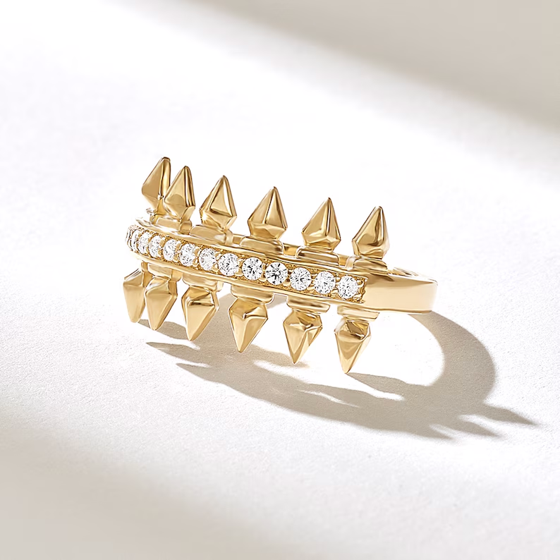 密鑲天然鑽石矛形戒指 | 14k 純金個性戒指 | 幾何尖頭設計