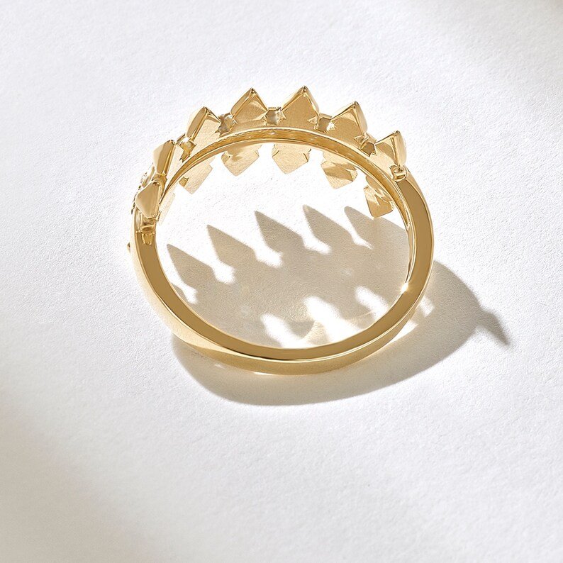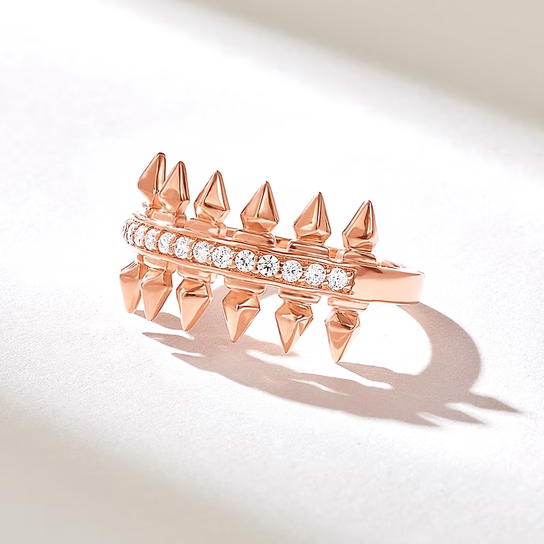 一個 密鑲天然鑽石矛形戒指 在 14K純金,以 幾何尖頭設計 和 0.14克拉天然鑽石 的 G – H 顏色和 VS-SI 淨度.