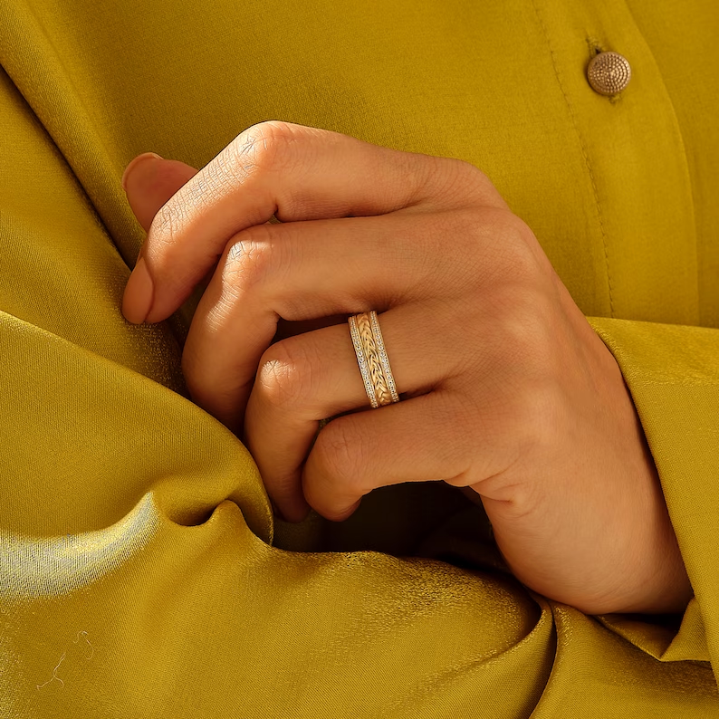 麥穗編織圖案象徵團結、力量和繁榮,是完美的結婚戒指或週年紀念戒指。無論單獨佩戴,還是與訂婚戒指疊戴,這款戒指都能為您的愛情故事獻上濃墨重彩的讚歌。